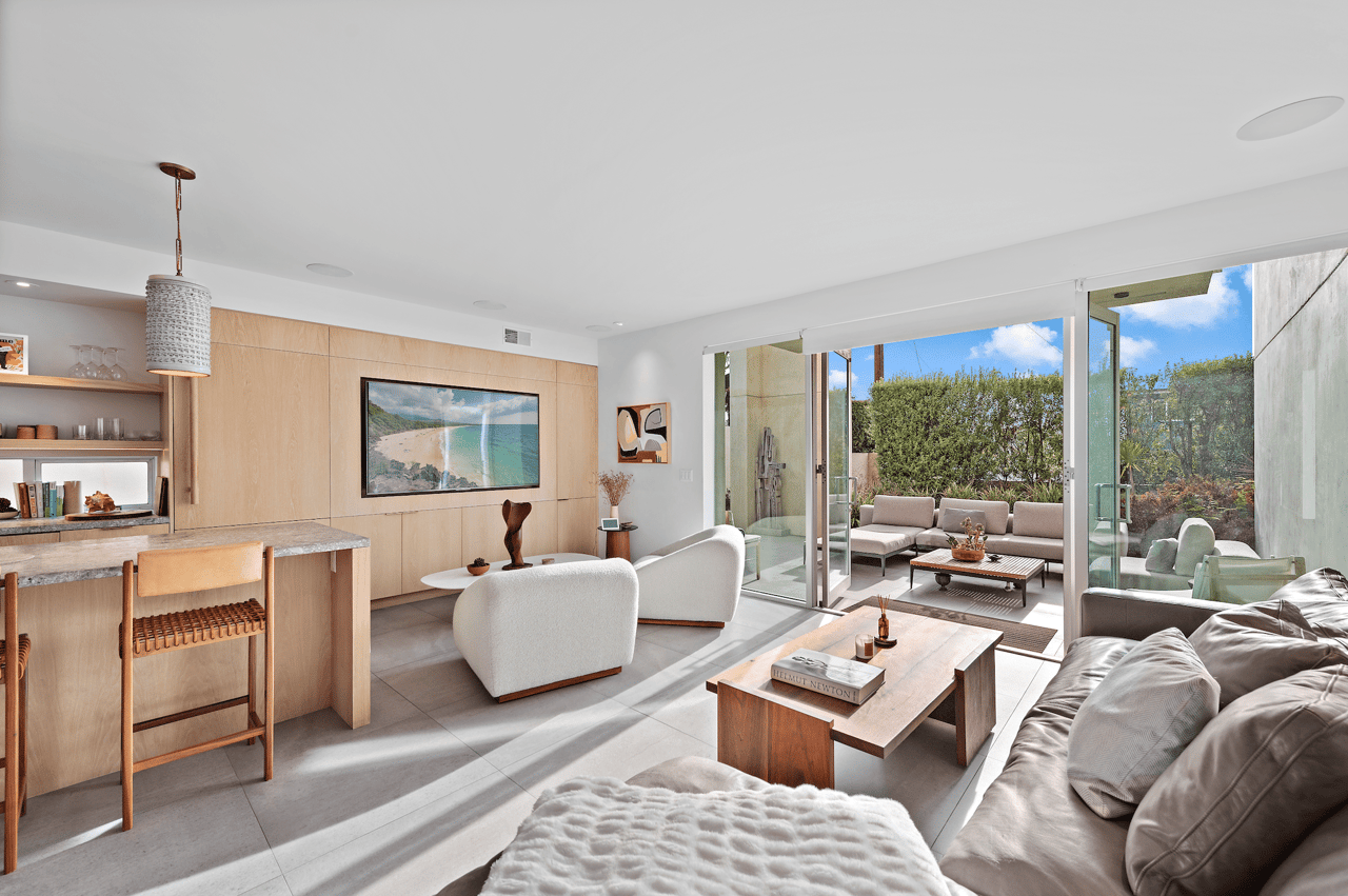 From the moment you step inside, you're greeted by a clean, modern aesthetic with just the right amount of warmth. The kitchen is the centerpiece of this design-forward home. Picture this: sleek, minimalist Ceppo di Gre Dolomite counters paired with hand-bleached White Oak cabinets, creating a calming yet sophisticated atmosphere. Whether you're whipping up a gourmet meal on the Bertazzoni gas stove or pulling your favorite vintage from the Thermador wine fridge, this space is ready for both casual dinners and grand entertaining. The kitchen opens seamlessly into the spacious dining area and living room, where more custom White Oak built-ins add both style and storage. Floor-to-ceiling glass windows and doors invite natural light and coastal breezes while creating a smooth indoor-outdoor transition to your patio and yard—a perfect spot for al fresco dining or evening relaxation.